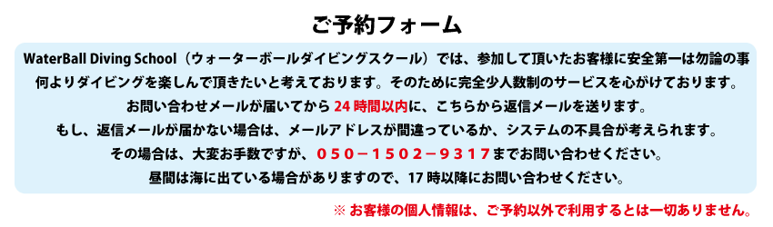 | WBのトップページ | 個人情報保護法に関する基本方針 | ダイビング料金 | よくある質問 | お問い合わせ | ご予約フォーム | リンク集 Copyright(C)since2011 Water Ball Diving School All Rights Reserved |